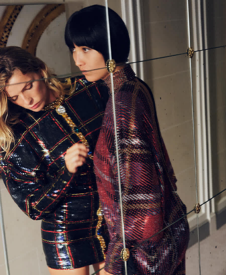 Architectural lines merge with fluid silhouettes; tweeds glimmer with subtle sequins,